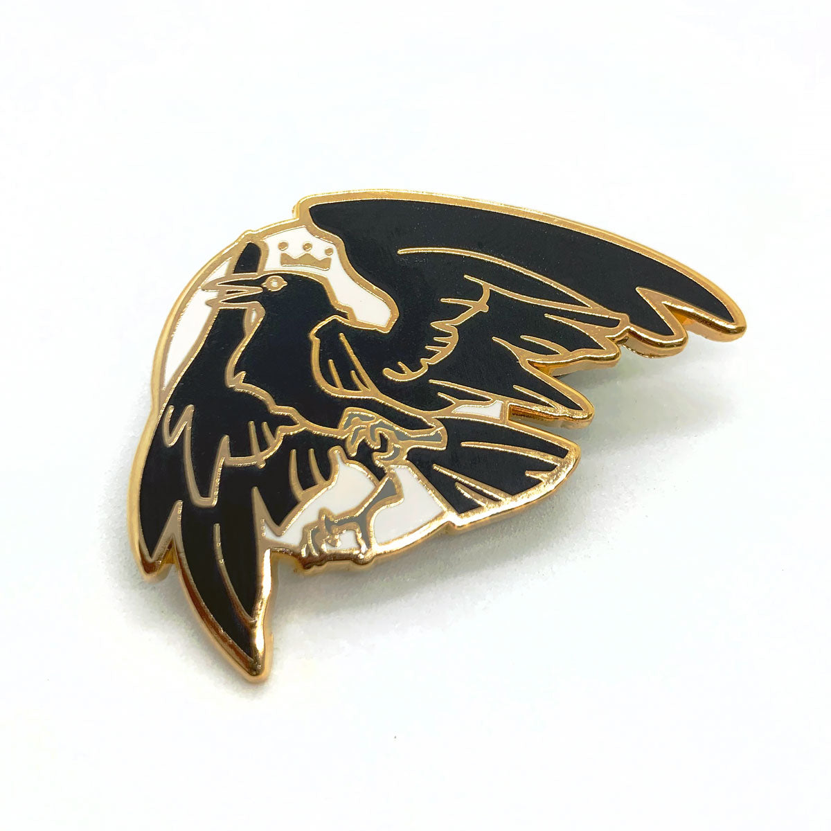 1.75" gold plated hard enamel pin with rubber clasps featuring an original design. Shipped with a stiff backing card.