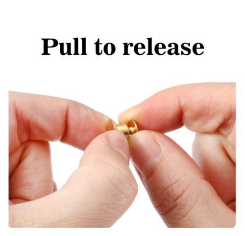 Locking clasps are a more secure attachment to help keep pins safe. To open the clasp, pull the large flat circle on the clasp back to release the mechanism and move the base either forward or backward to attach or remove the clasp.