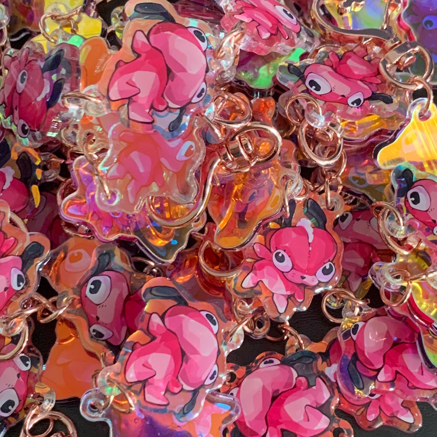 Original designs printed front/back on rainbow clear acrylic with single side epoxy. Comes with a heart charm ring.