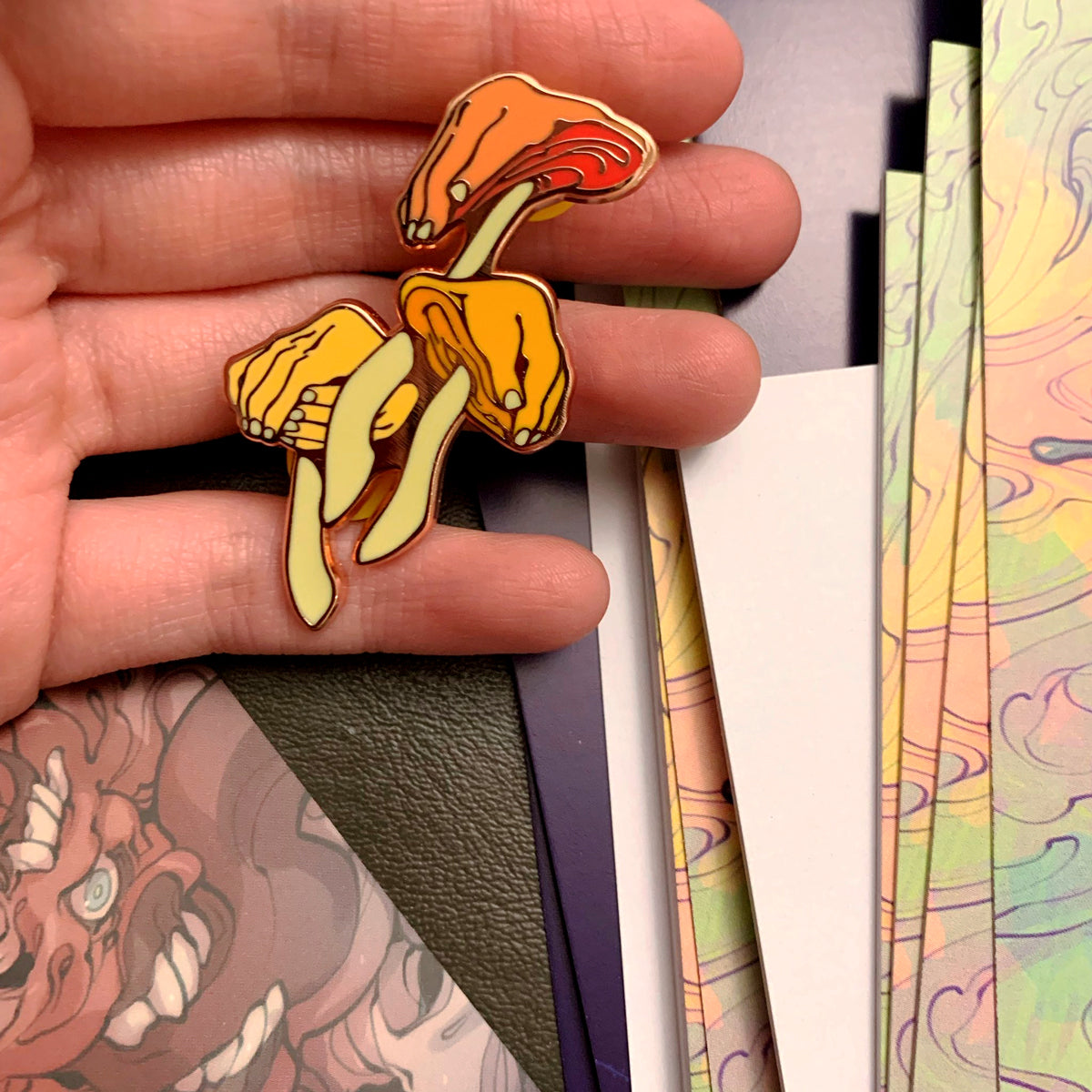 2" copper plated hard enamel pin with rubber clasps featuring an original design. Shipped with a stiff backing card.